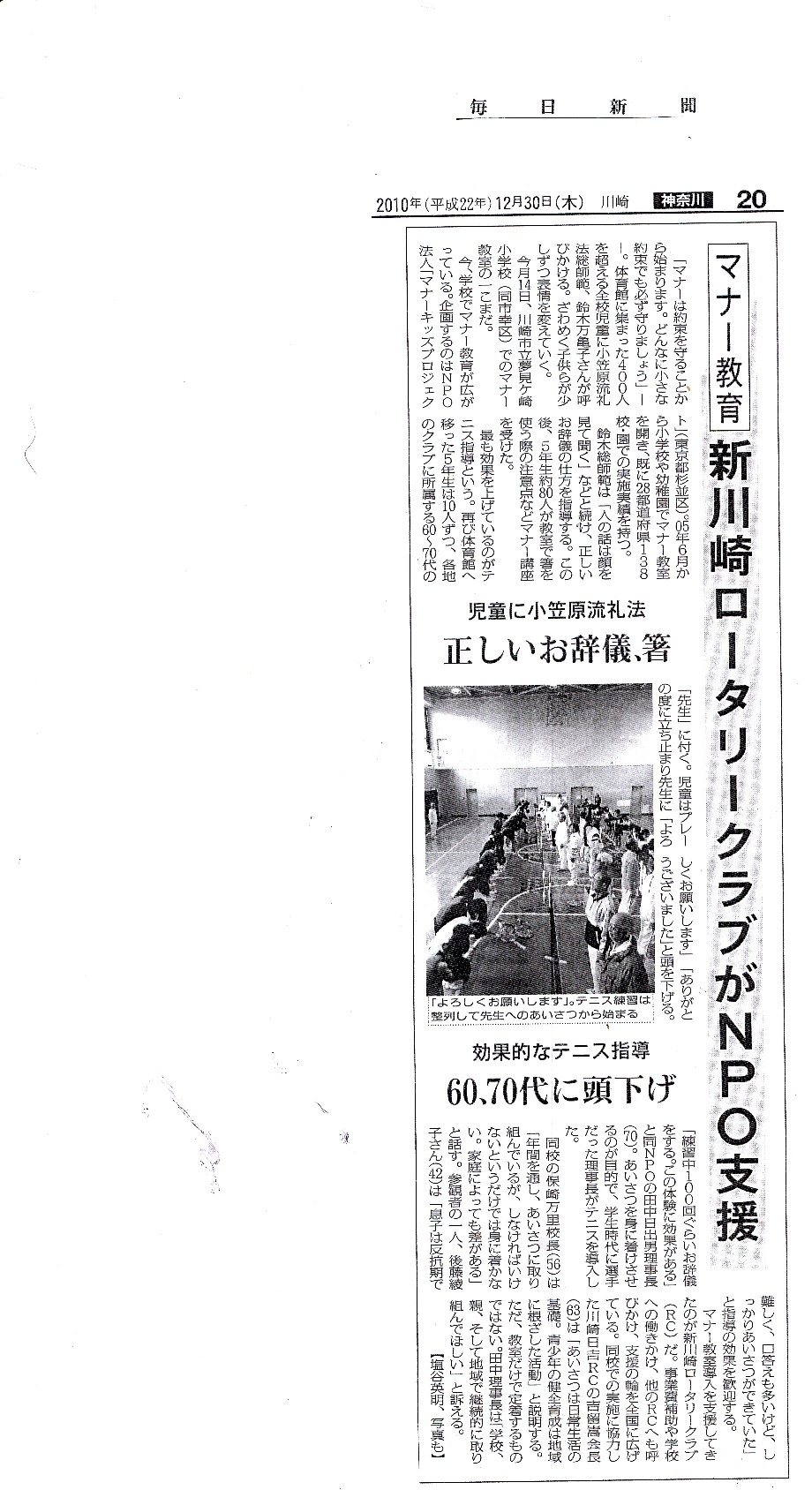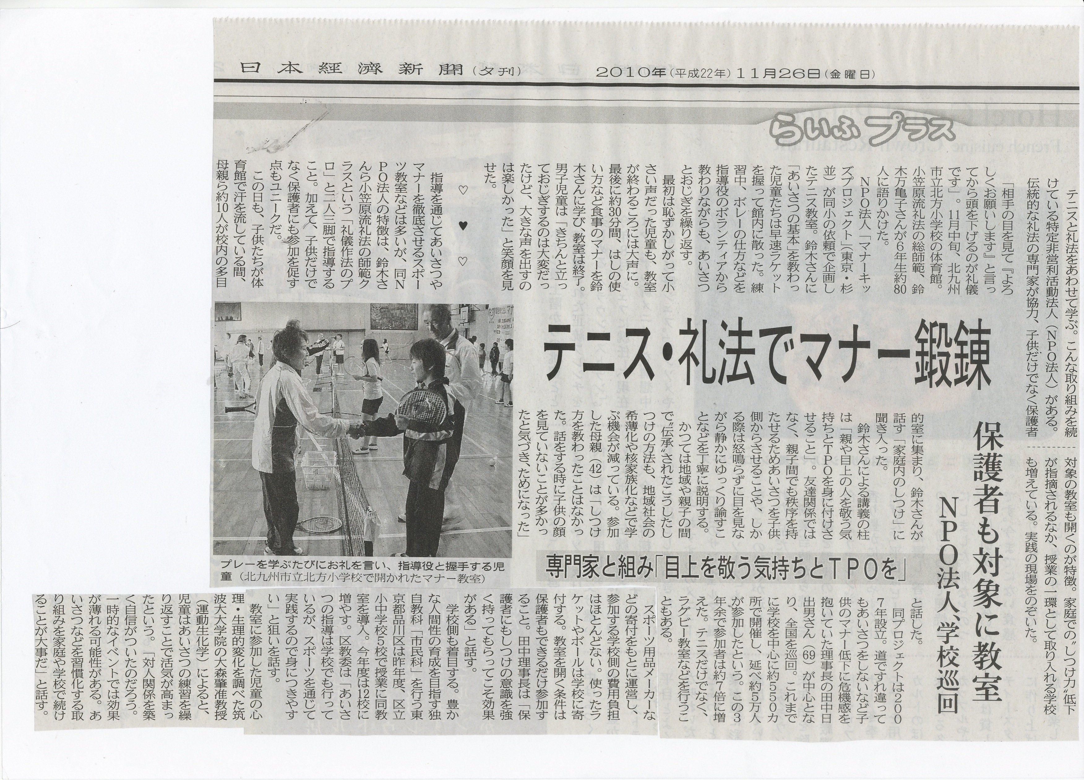 | 2006・5・1 | 東京都杉並区教育委員会「マナーキッズテニス教室の体育授業採用の波及効果」として時報に掲載 | |