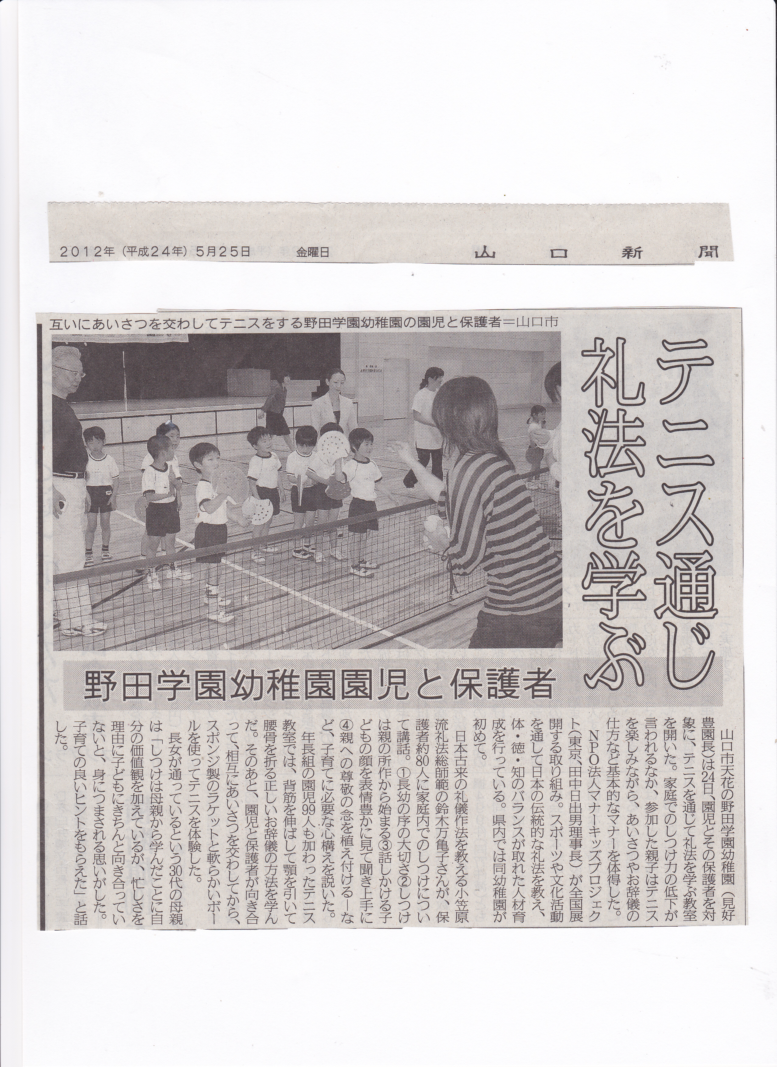 | 2012・5・25 | 山口県山口市野田学園幼稚マナーキッズ親子てのひらテニス教室山口新聞記事掲載 | 20120525_history004.jpg |