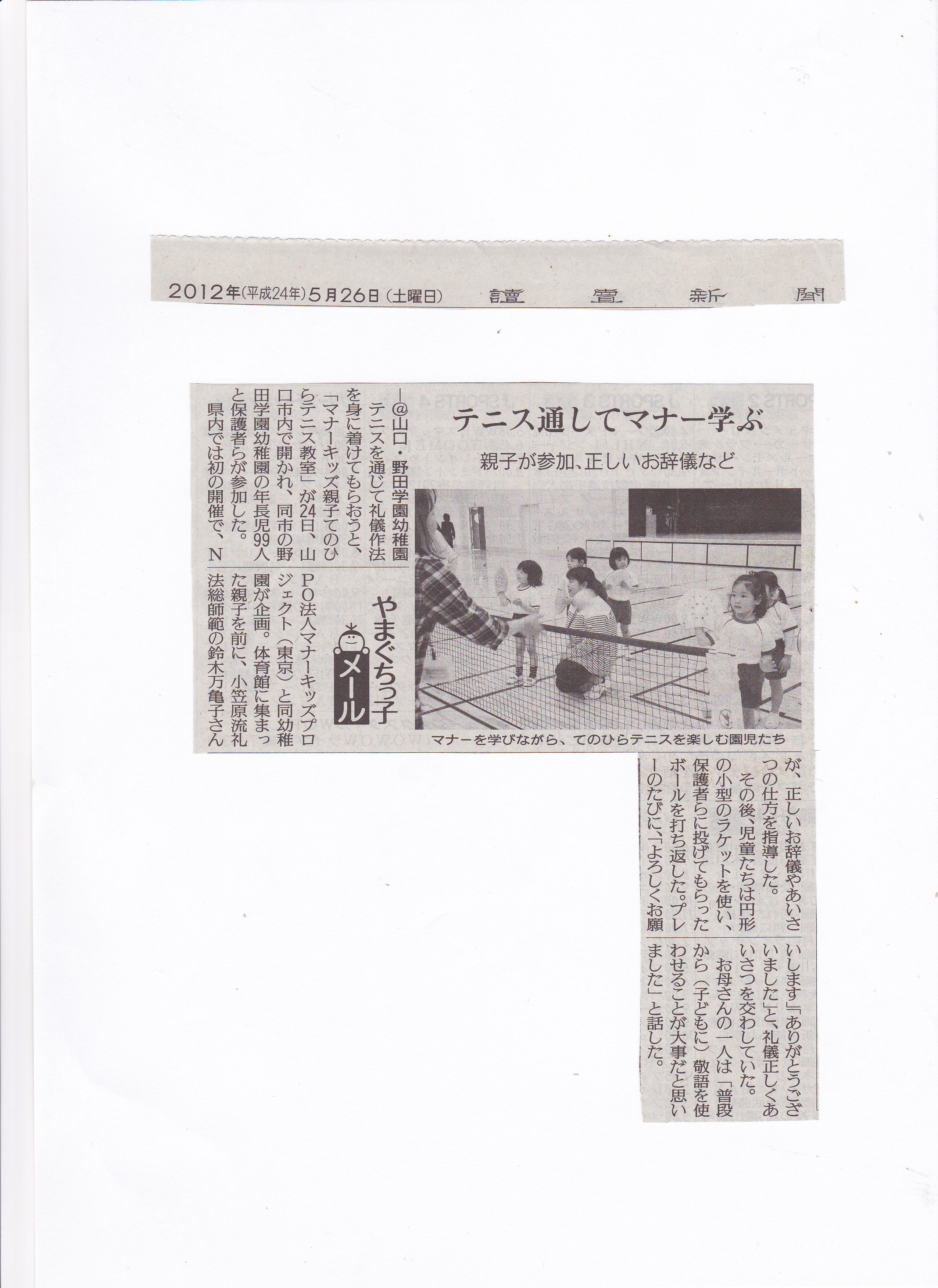| 2012・5・26 | 山口県山口市野田学園幼稚マナーキッズ親子てのひらテニス教室読売新聞記事掲載 | 20120526_history005.jpg |